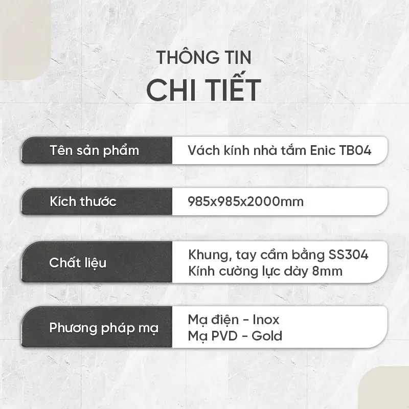 Với kích thước 1000x1000x2000mm, vách kính Enic TB04 là lựa chọn lý tưởng cho những phòng tắm có diện tích vừa phải. Sản phẩm có hai màu sắc sang trọng: màu inox và màu gold, dễ dàng phù hợp với mọi phong cách trang trí.