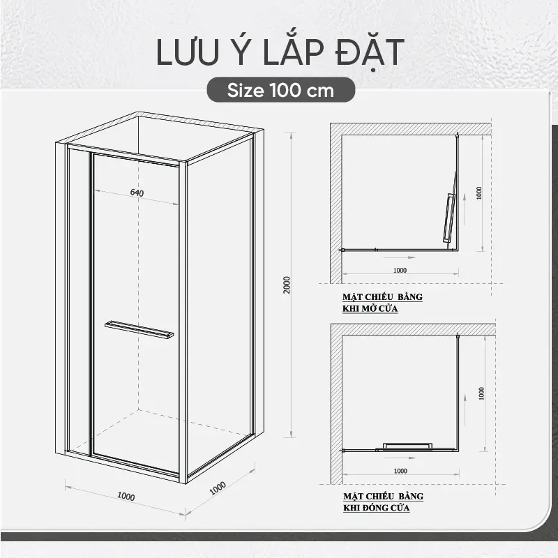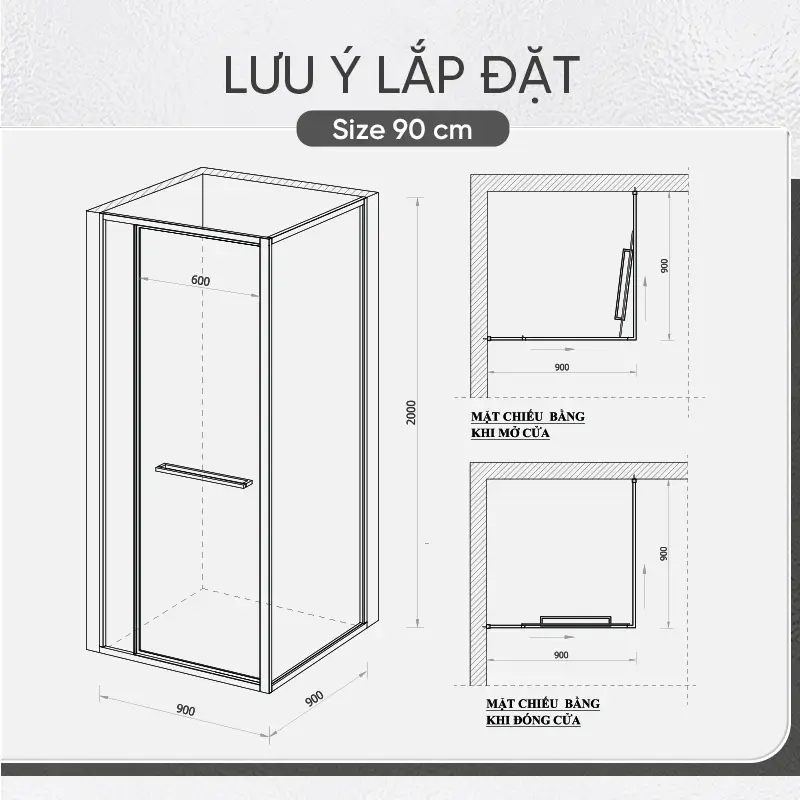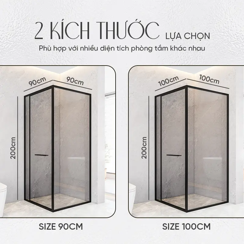 Với kích thước 900x900x2000 mm, vách kính nhà tắm sẽ phù hợp với nhiều không gian phòng tắm khác nhau, mang đến sự linh hoạt trong việc lắp đặt. Bạn có thể lựa chọn giữa hai màu sắc tinh tế: xám và inox, dễ dàng hòa hợp với nhiều kiểu thiết kế nội thất phòng tắm.