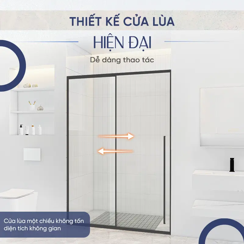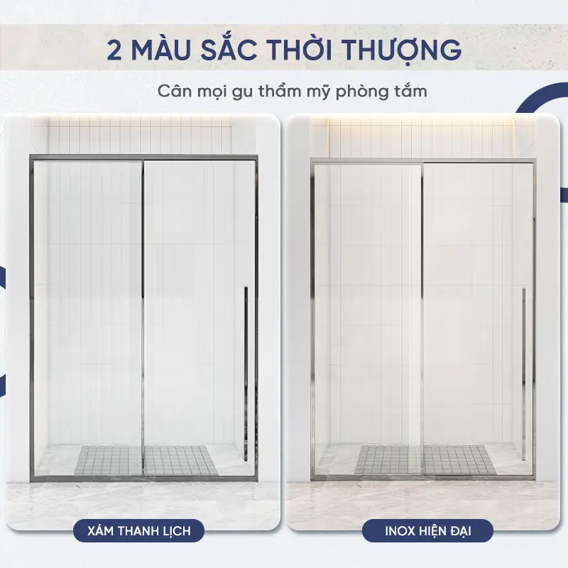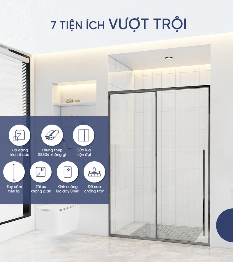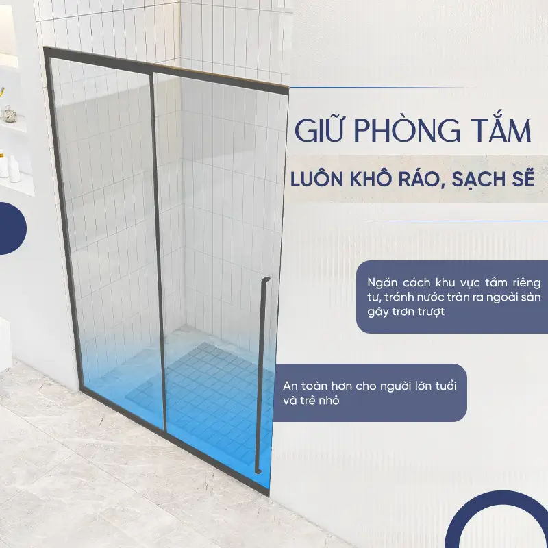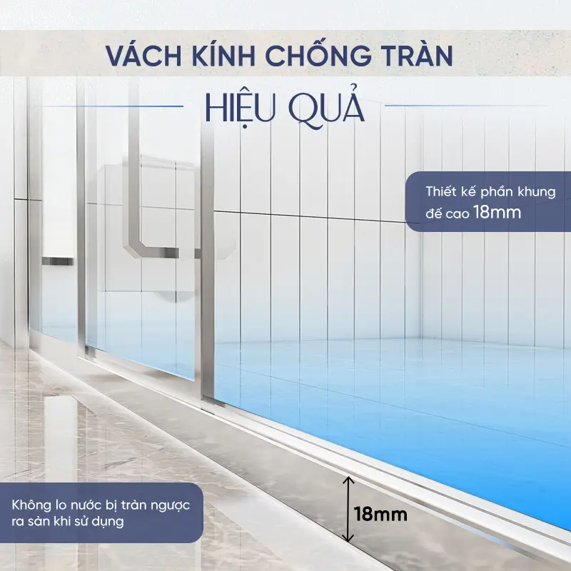 Với khung inox SS304 chắc chắn và kính cường lực dày 8mm, vách kính nhà tắm đem lại cảm giác an toàn trong suốt quá trình sử dụng. Thiết kế cửa lùa tiết kiệm không gian tối đa, trong khi thanh trượt được chế tác tinh xảo, đảm bảo việc đóng mở cửa luôn êm ái và không gây tiếng ồn. Khung đế cao 18mm cũng giúp ngăn ngừa tình trạng nước tràn ra ngoài, giữ cho phòng tắm luôn khô ráo và sạch sẽ.