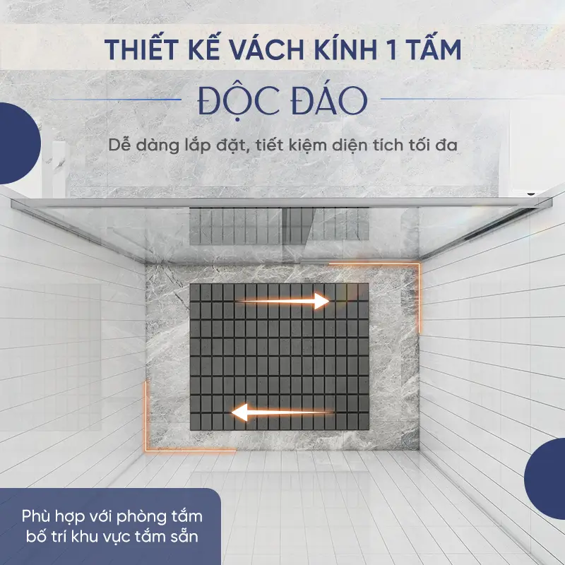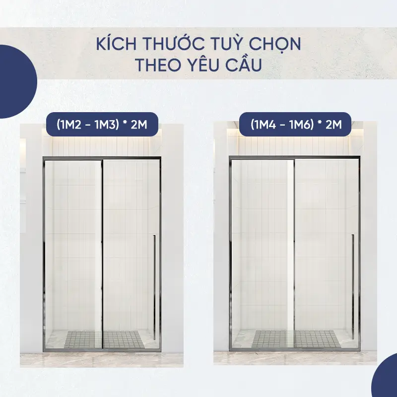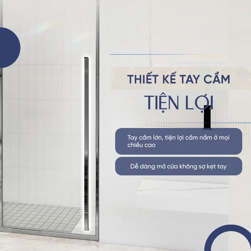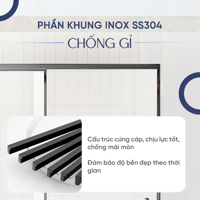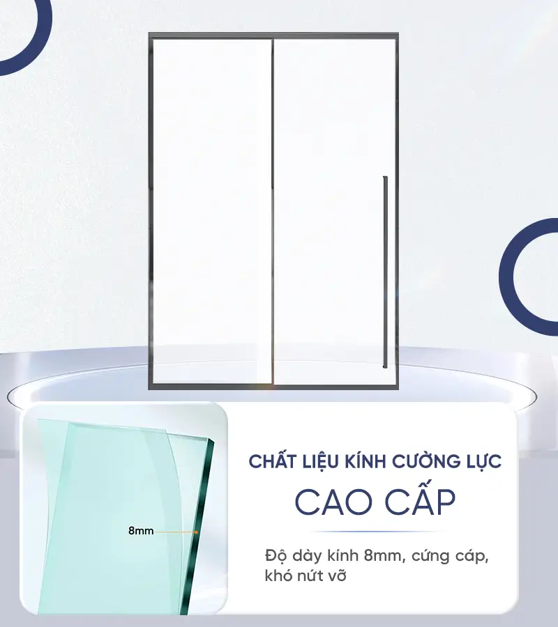 Với khung inox SS304 chắc chắn và kính cường lực dày 8mm, vách kính nhà tắm đem lại cảm giác an toàn trong suốt quá trình sử dụng. Thiết kế cửa lùa tiết kiệm không gian tối đa, trong khi thanh trượt được chế tác tinh xảo, đảm bảo việc đóng mở cửa luôn êm ái và không gây tiếng ồn. Khung đế cao 18mm cũng giúp ngăn ngừa tình trạng nước tràn ra ngoài, giữ cho phòng tắm luôn khô ráo và sạch sẽ.