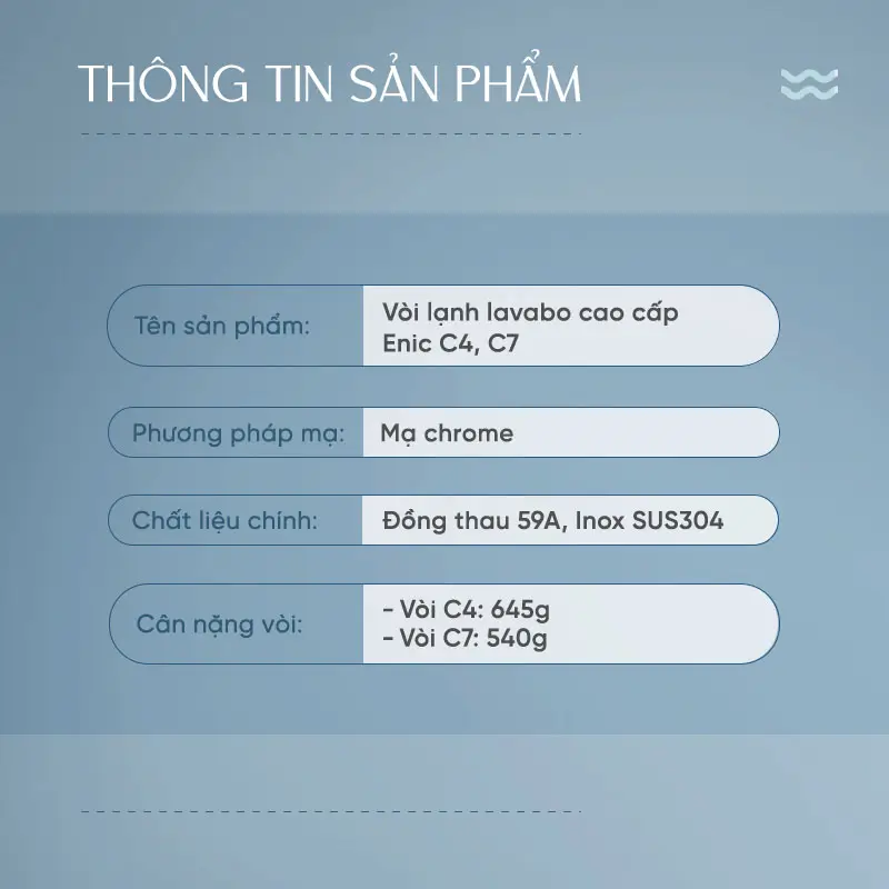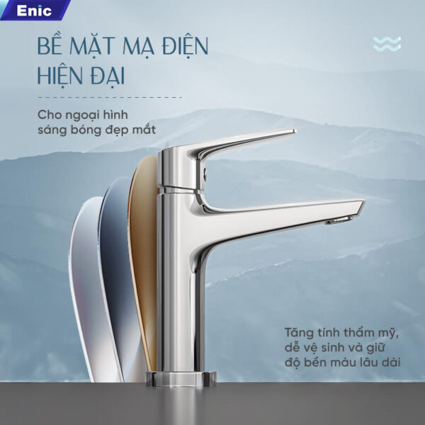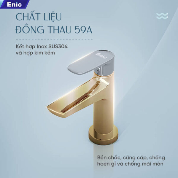 Vòi lavabo Enic C4 và C7 được chế tạo từ vật liệu chất lượng cao, với thân vòi là sự kết hợp của Đồng thau 59A (với hàm lượng đồng cao) cùng Inox SUS304 và hợp kim kẽm, đảm bảo khả năng chống gỉ sét, chống ăn mòn và độ bền tối đa trong môi trường ẩm ướt. Bề mặt vòi được xử lý bằng công nghệ Mạ Chrome sáng bóng, không chỉ tăng tính thẩm mỹ mà còn giúp việc vệ sinh trở nên dễ dàng hơn.