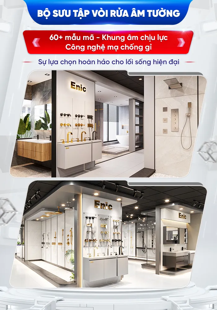 Enic sở hữu 2 loại vòi lavabo âm tường: Vòi âm tường truyền thống và vòi chậu lavabo gắntường xoay chiều 2 van.