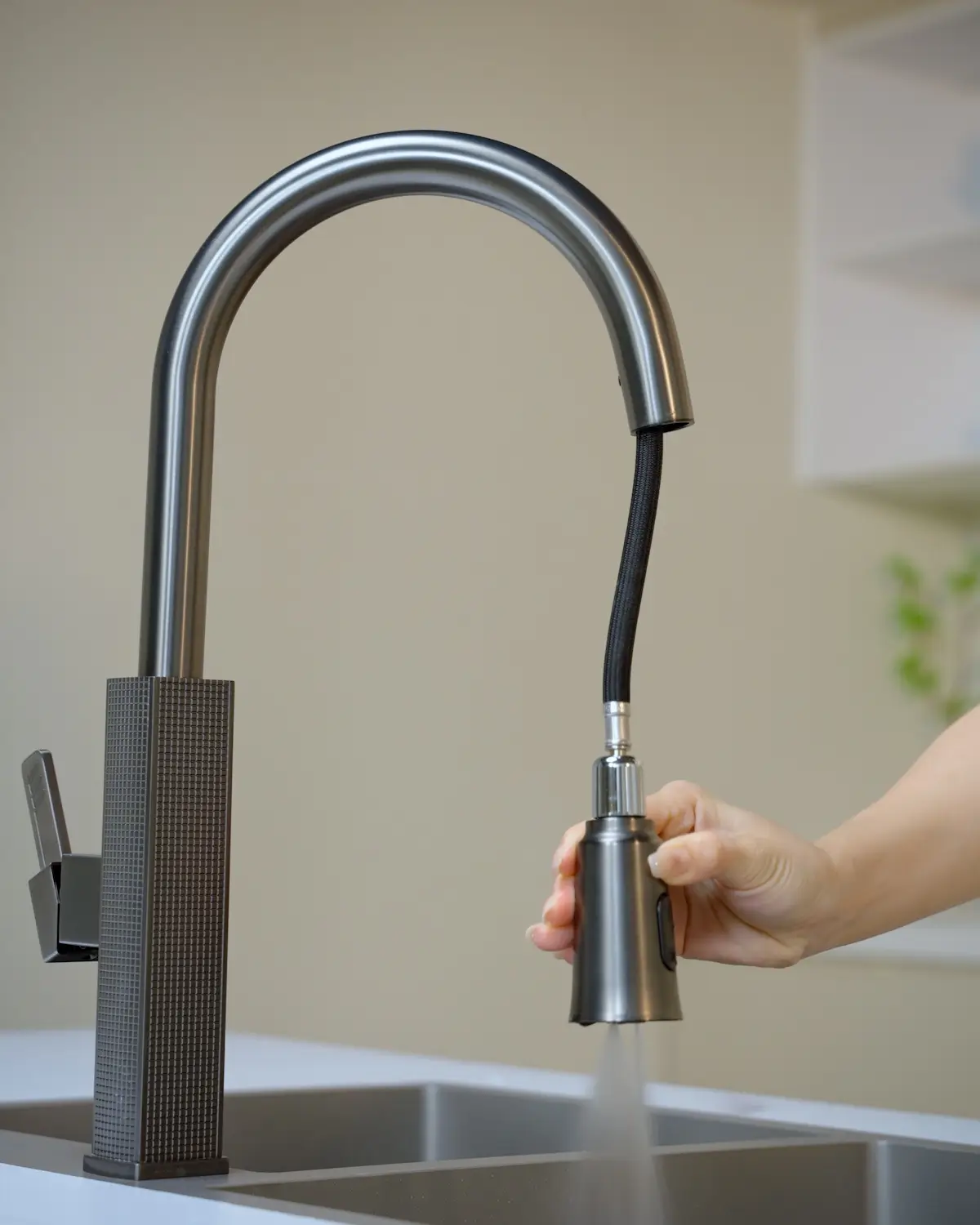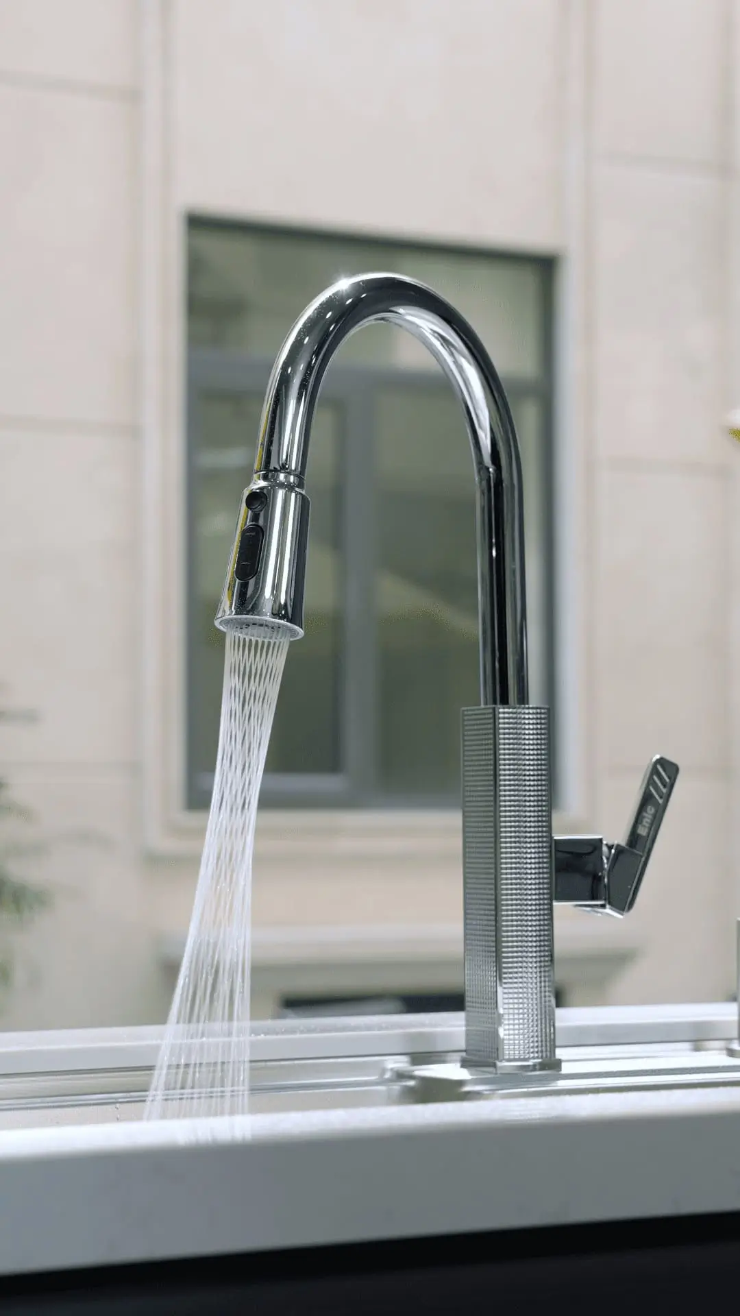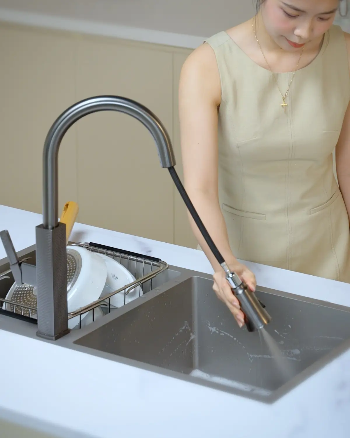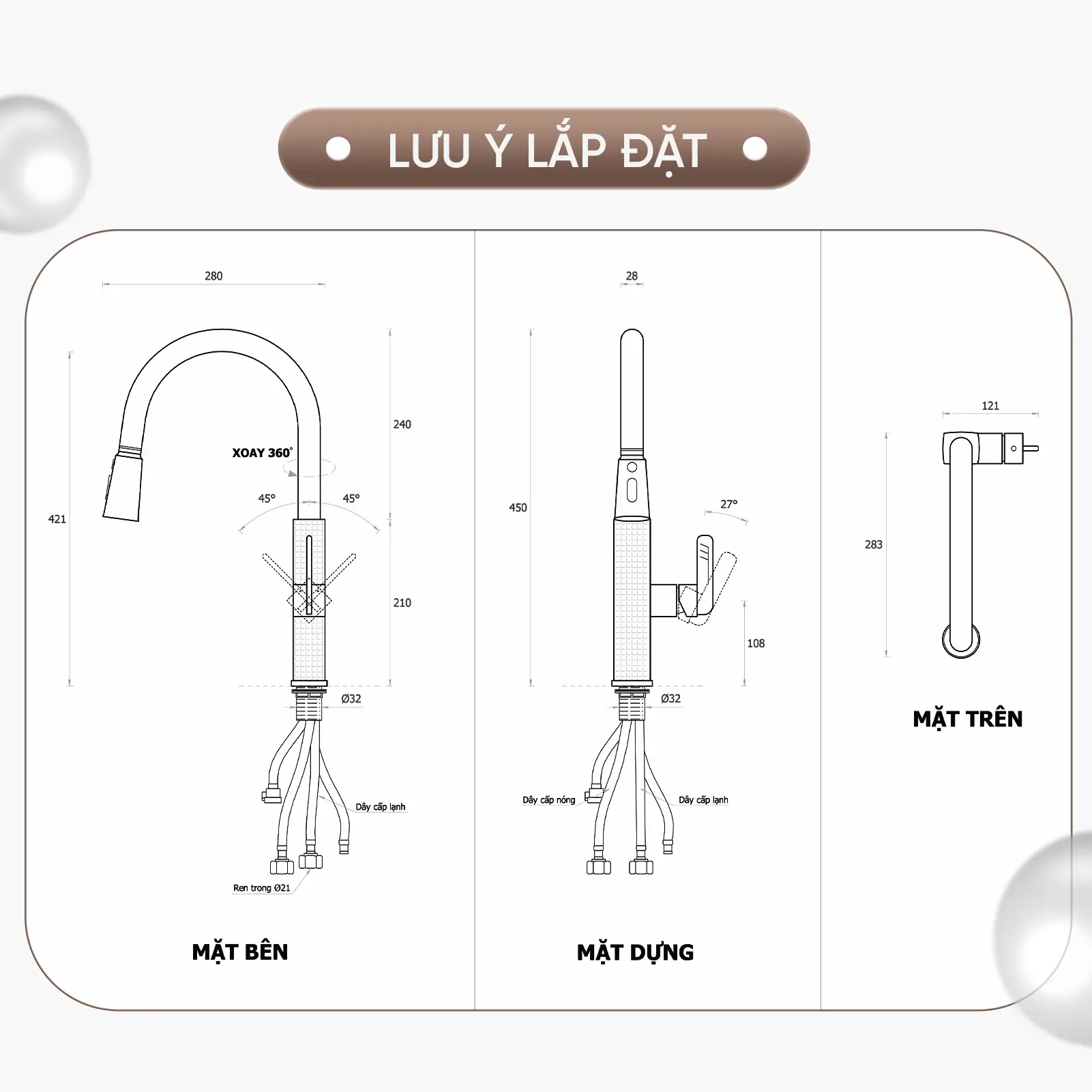 Thiết kế này khá sáng tạo, lắp vào không gian bếp có điểm nhấn, vòi đồng thau cầm nặng tay chắc chắn lắm, đầu vòi nhựa nhưng nhìn tổng thể đồng bộ, đầy đủ nước nóng lạnh, 3 chế độ nước, dây rútvàthu về mượt nhanh