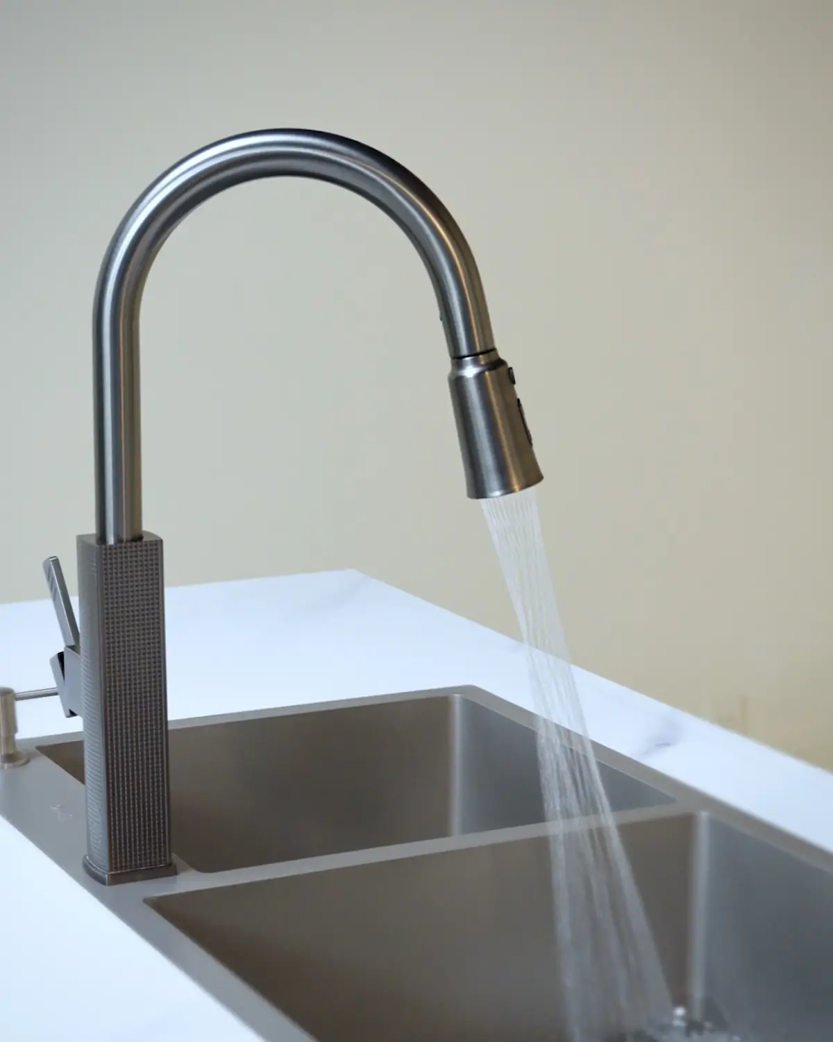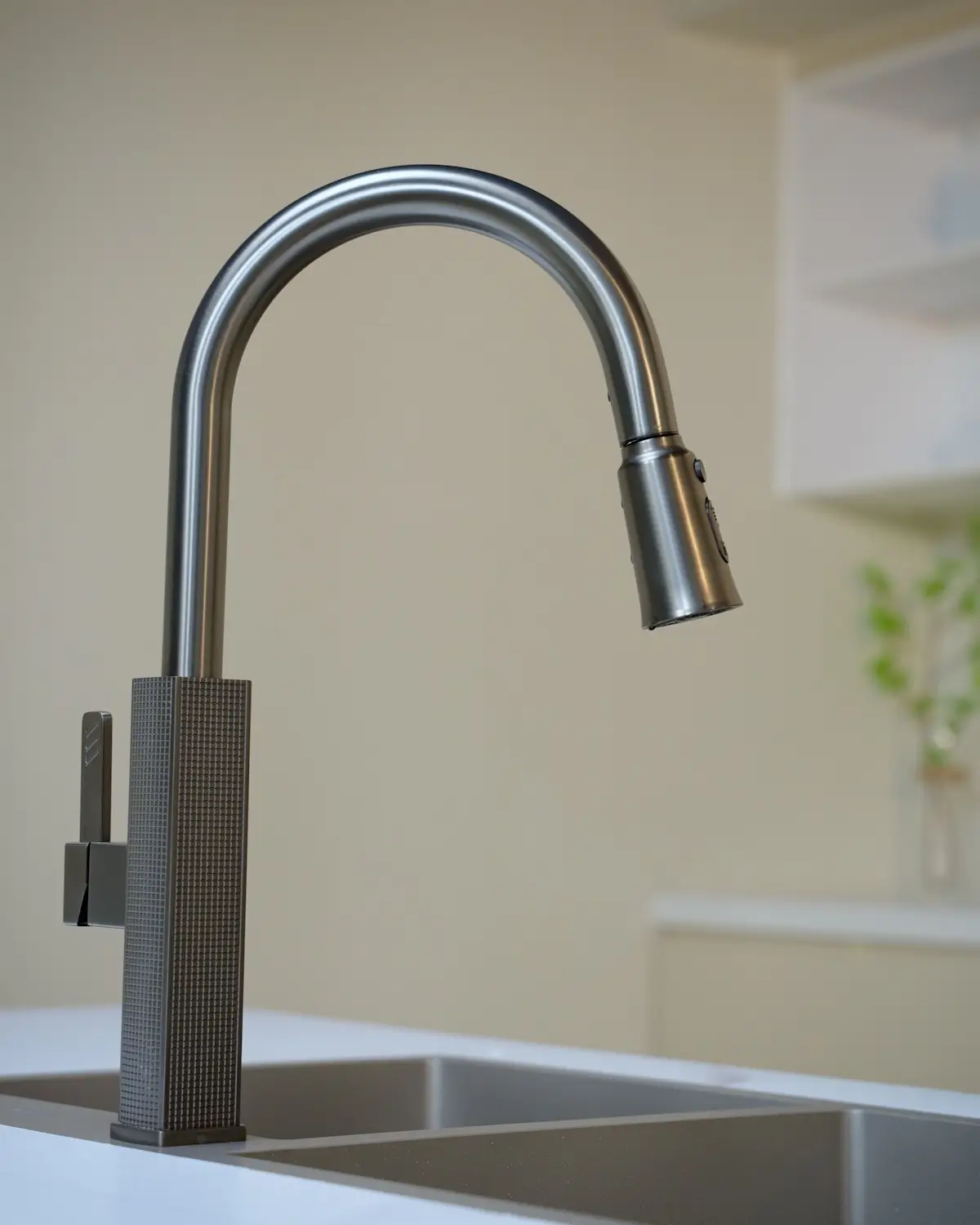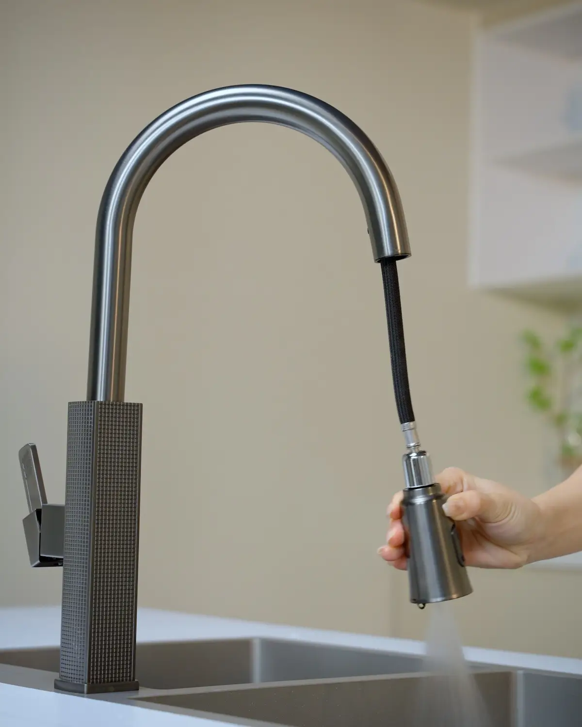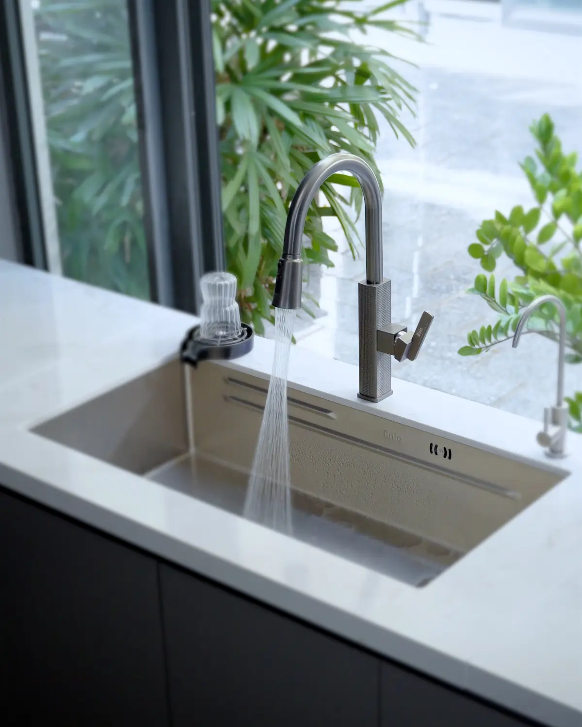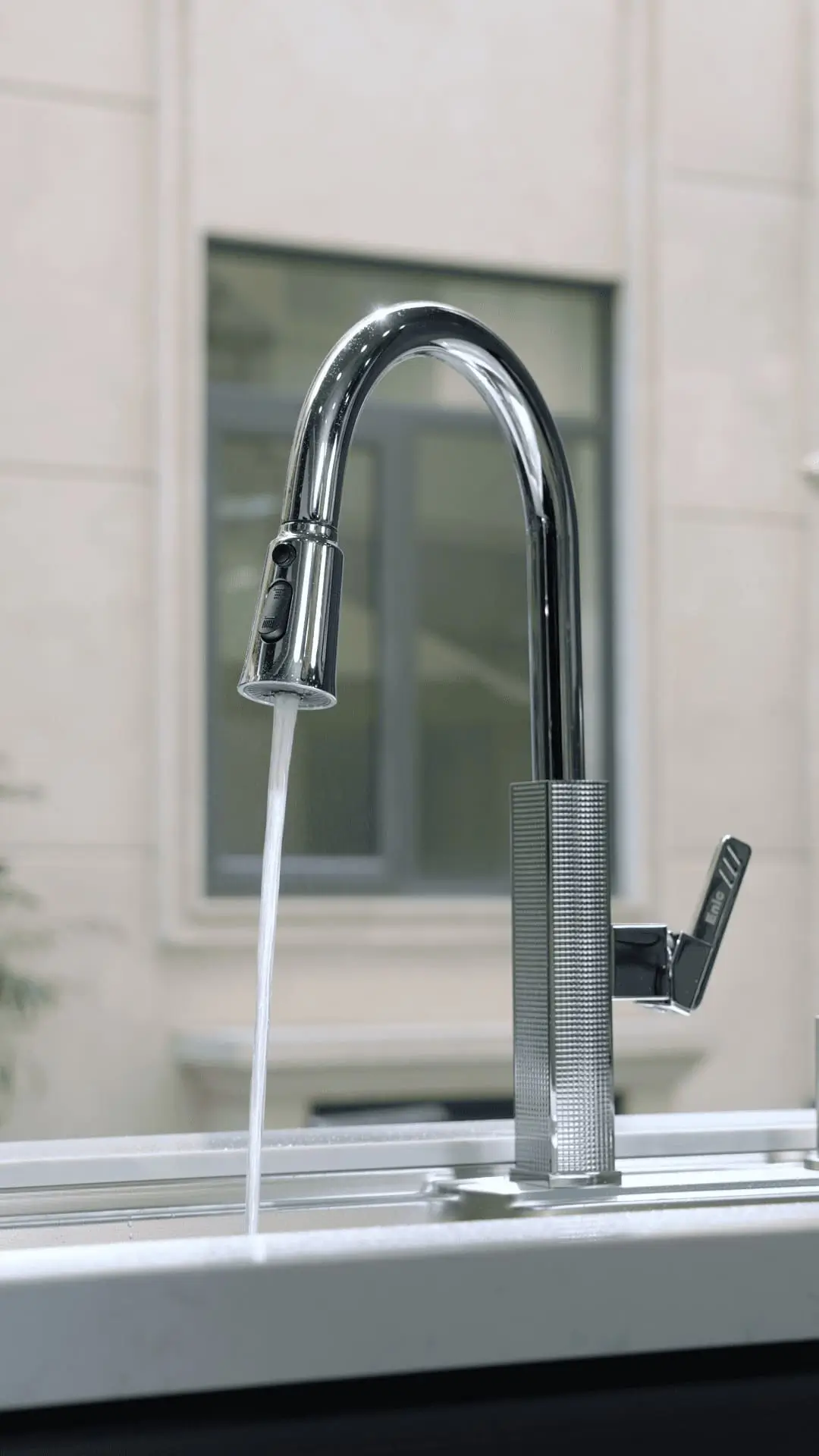 Thiết kế này khá sáng tạo, lắp vào không gian bếp có điểm nhấn, vòi đồng thau cầm nặng tay chắc chắn lắm, đầu vòi nhựa nhưng nhìn tổng thể đồng bộ, đầy đủ nước nóng lạnh, 3 chế độ nước, dây rútvàthu về mượt nhanh