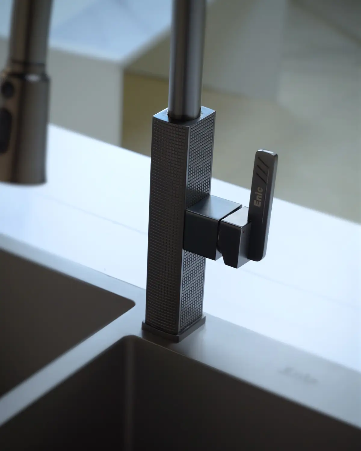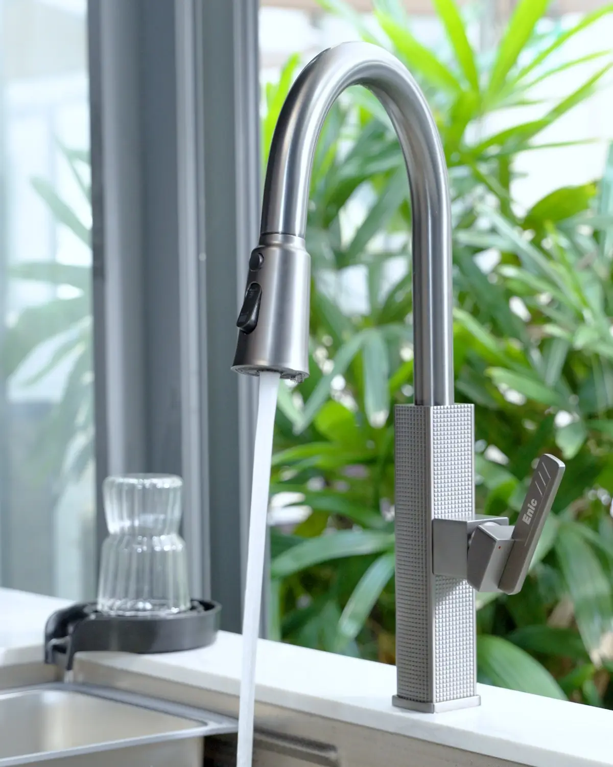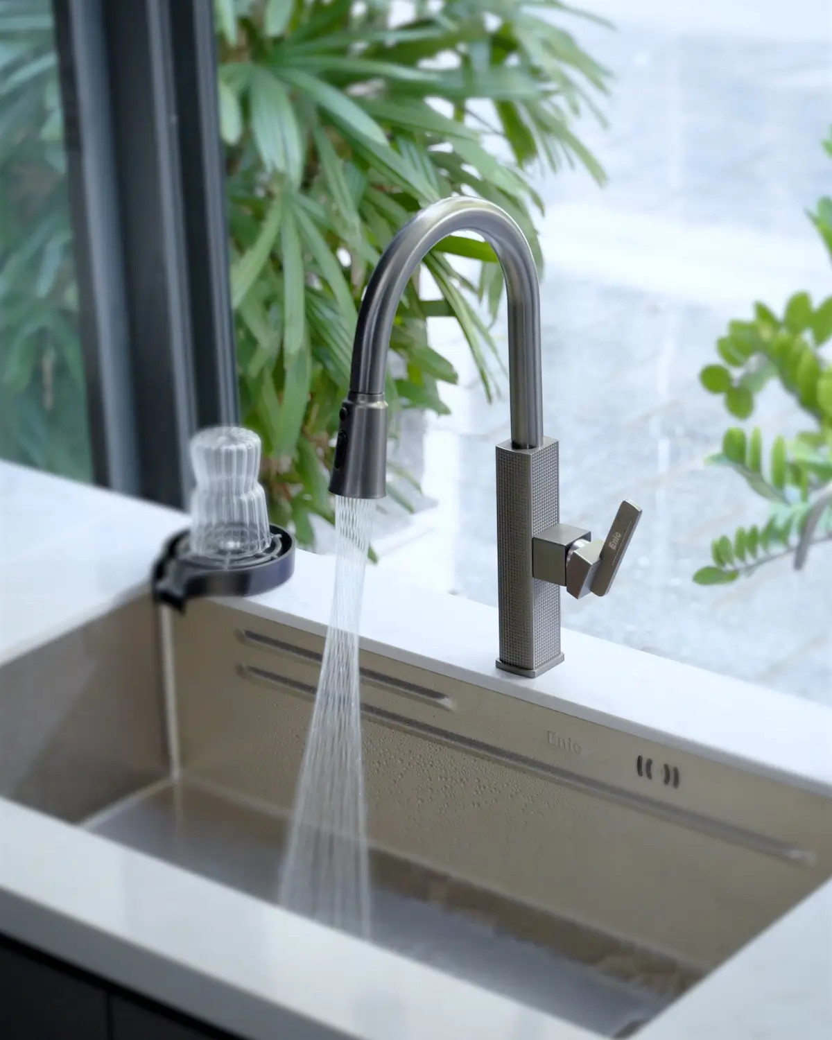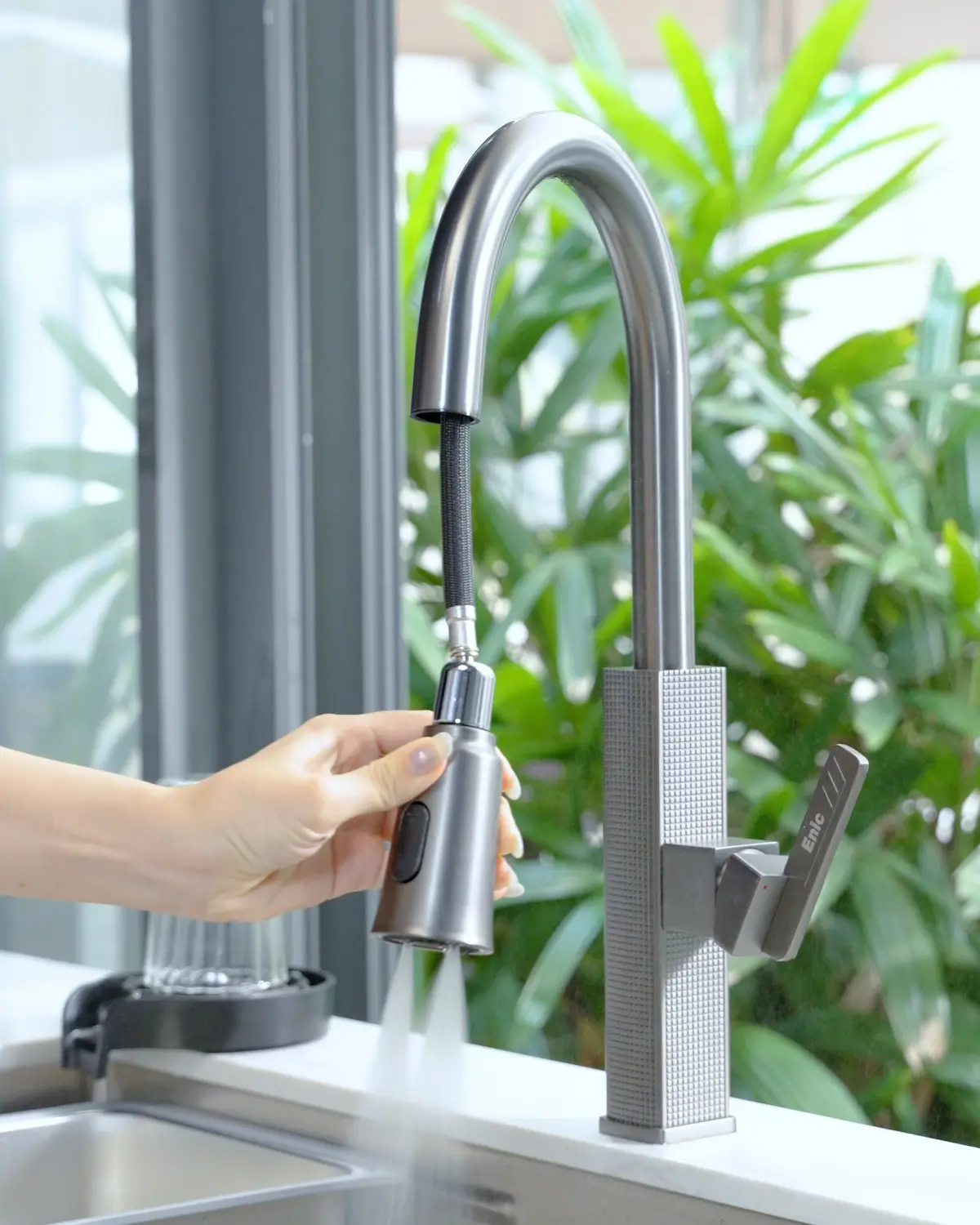 Vòi rửa bát nóng lạnh vòi rút xoay Enic P6 điều chỉnh nước nóng – lạnh linh hoạt, mang lại trải nghiệm sử dụng đa dạng. Điểm nổi bật của Enic P6 là vòi dây rút dài 58cm với 3 chế độ phun: tia mạnh, cánh hoa và tạo bọt. Thiết kế xoay 360 độ giúp tiếp cận mọi góc bồn rửa dễ dàng.