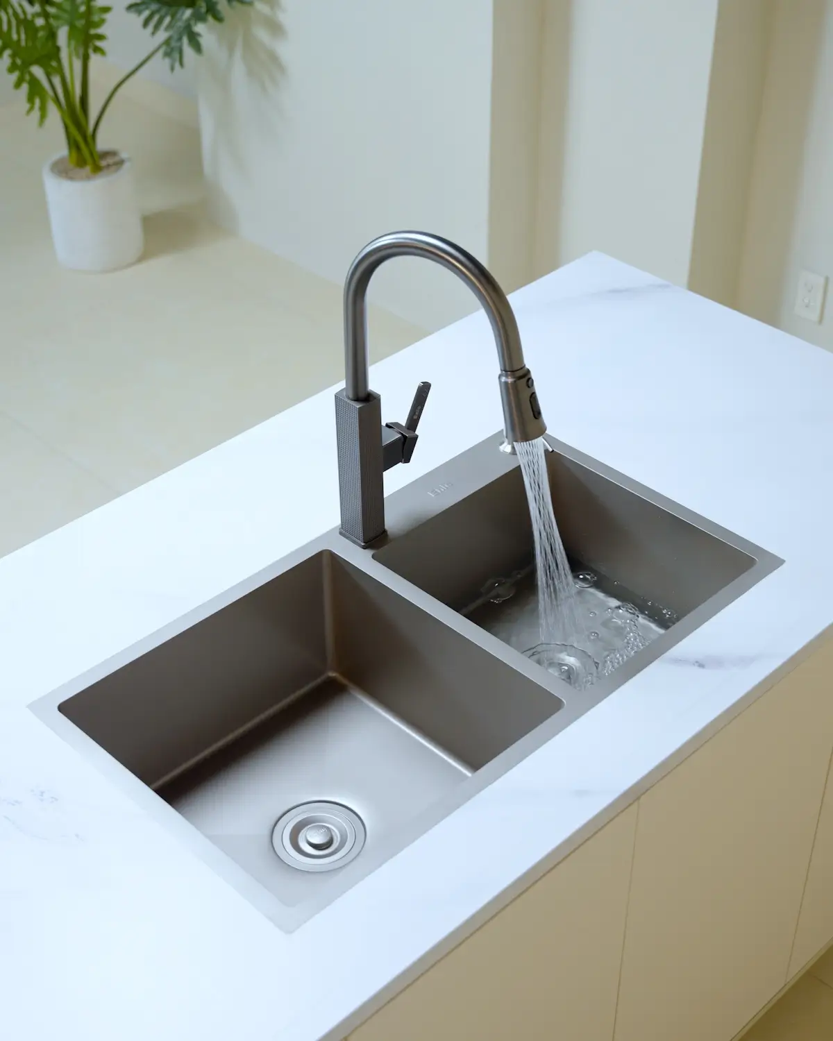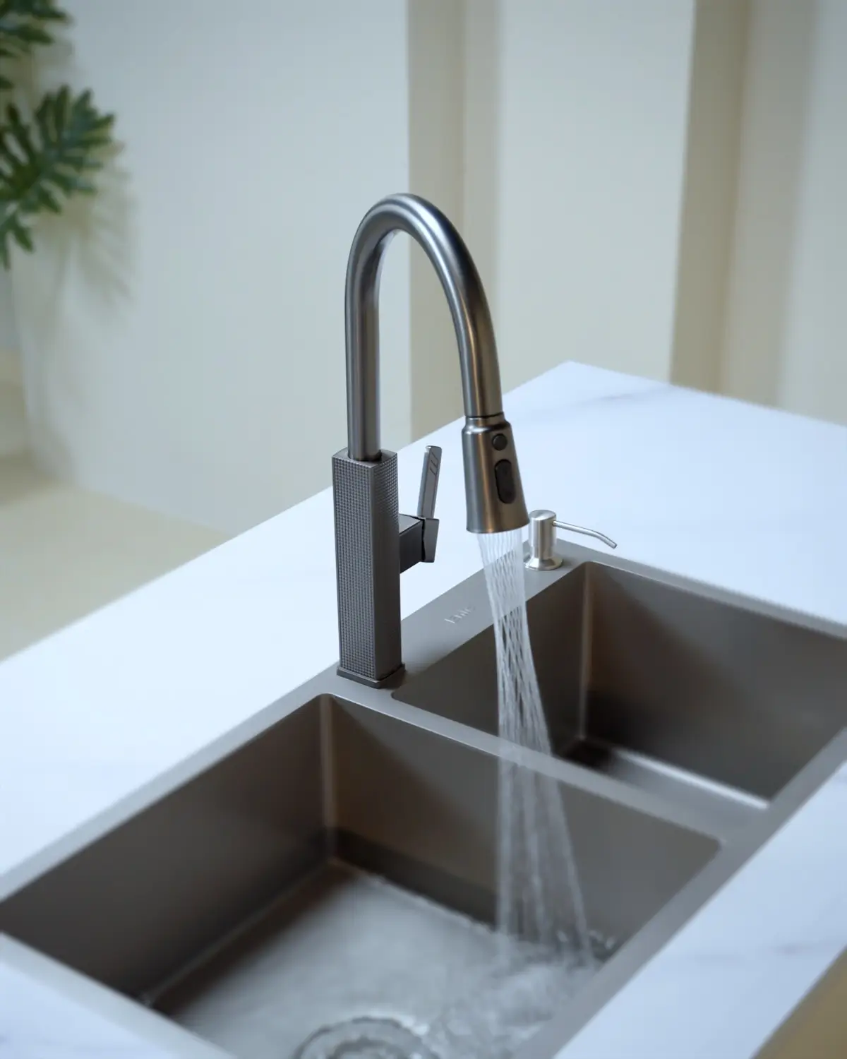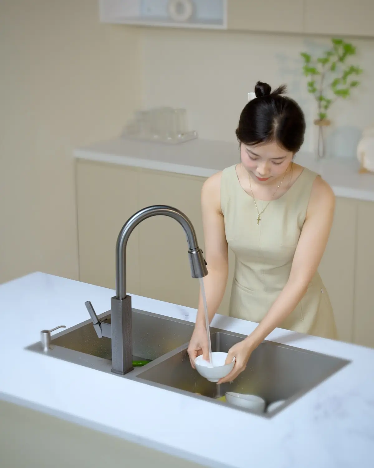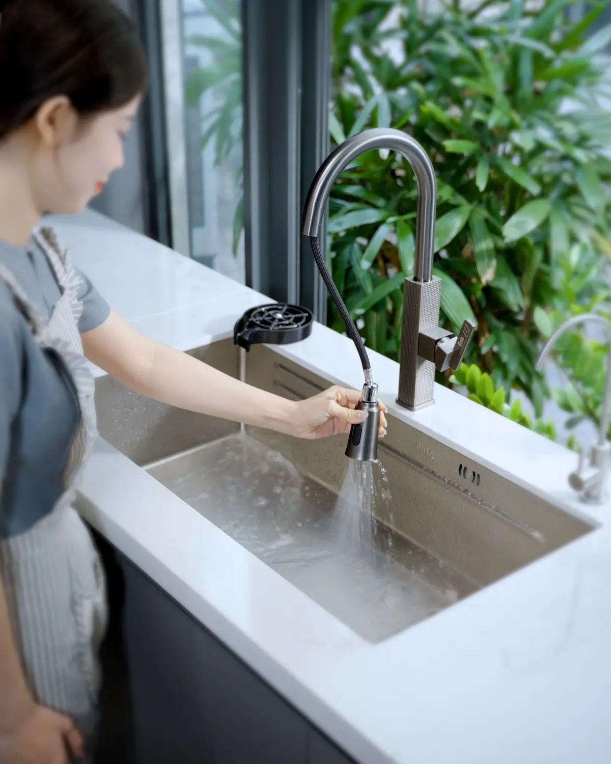 Vòi rửa bát nóng lạnh vòi rút xoay Enic P6 điều chỉnh nước nóng – lạnh linh hoạt, mang lại trải nghiệm sử dụng đa dạng. Điểm nổi bật của Enic P6 là vòi dây rút dài 58cm với 3 chế độ phun: tia mạnh, cánh hoa và tạo bọt. Thiết kế xoay 360 độ giúp tiếp cận mọi góc bồn rửa dễ dàng.