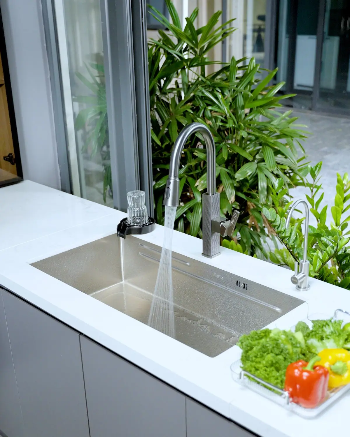 giá cao mua cái cũng hơi đắng đo, tranh thủ ra showwrom xem lại vẫn rất ưng, chiều kỹ thuật giao lắp luôn. dùng tiện, rửa rau rửa chén rất êm, có cảm hứng vào bếp hẳn