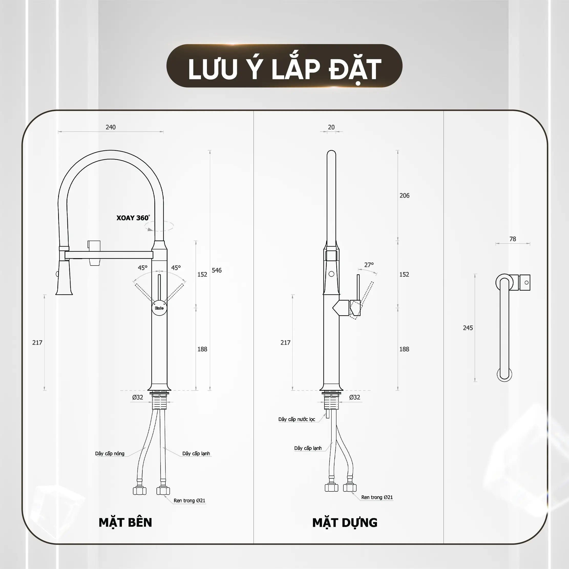 Với kích thước 245 x 78 x 546 mm, Enic P2 dễ dàng lắp đặt với phi chờ 35 – 38mm. Vòi hoạt động ổn định với áp lực nước từ 1kg/cm² (tương đương độ cao bồn chứa 10m).