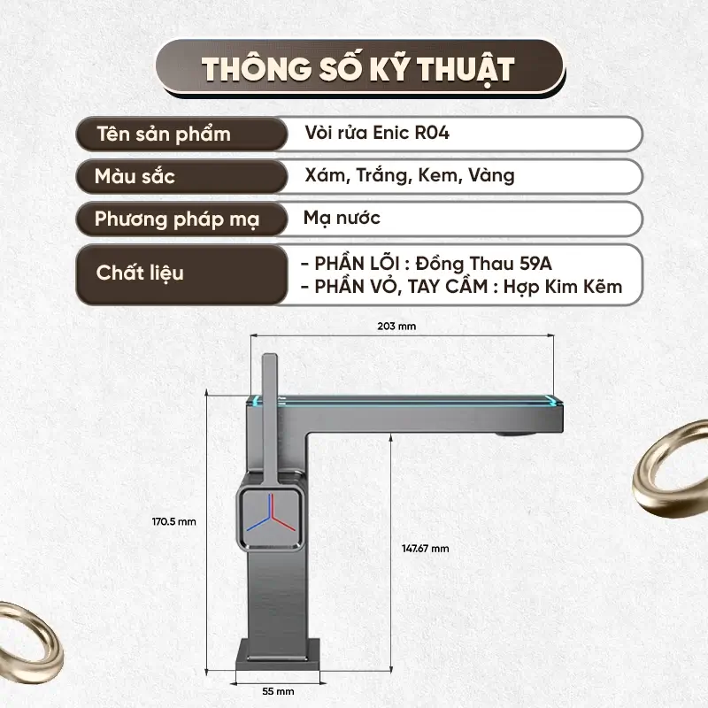 Nâng cấp trải nghiệm rửa mặt hàng ngày của bạn với Vòi lavabo Enic R04 – một phụ kiện phòng tắm nổi bật, kết hợp thiết kế hiện đại và tính năng công nghệ thông minh.
